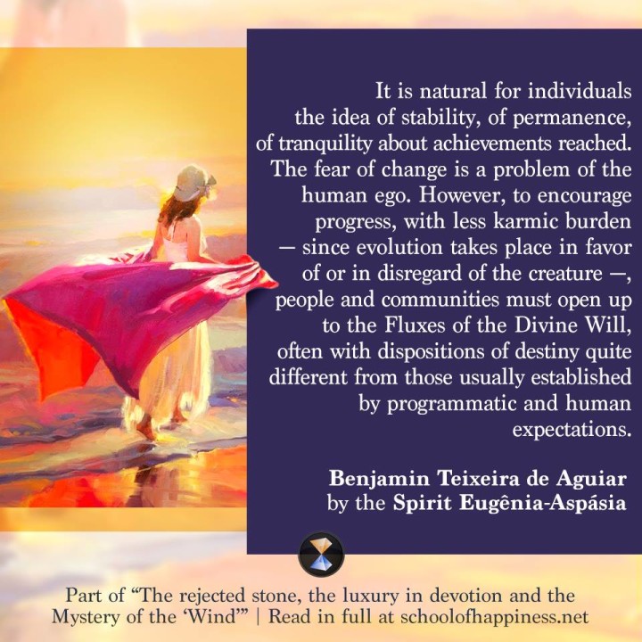 It is natural for individuals the idea of stability, of permanence, of tranquility about achievements reached. The fear of change is a problem of the human ego. However, to encourage progress, with less karmic burden – since evolution takes place in favor of or in disregard of the creature – people and communities must open up to the Fluxes of the Divine Will, often with dispositions of destiny quite different from those usually established by programmatic and human expectations.