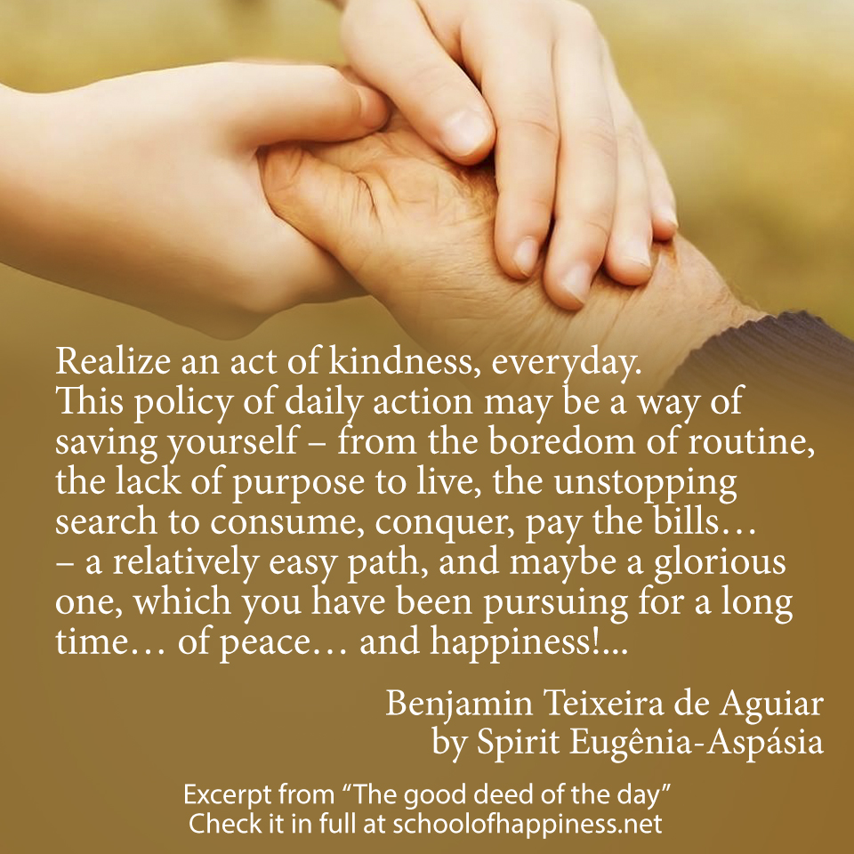 Realize an act of kindness, everyday. This policy of daily action may be a way of saving yourself – from the boredom of routine, the lack of purpose to live, the unstopping search to consume, conquer, pay the bills… – a relatively easy path, and maybe a glorious one, which you have been pursuing for a long time… of peace… and happiness!…