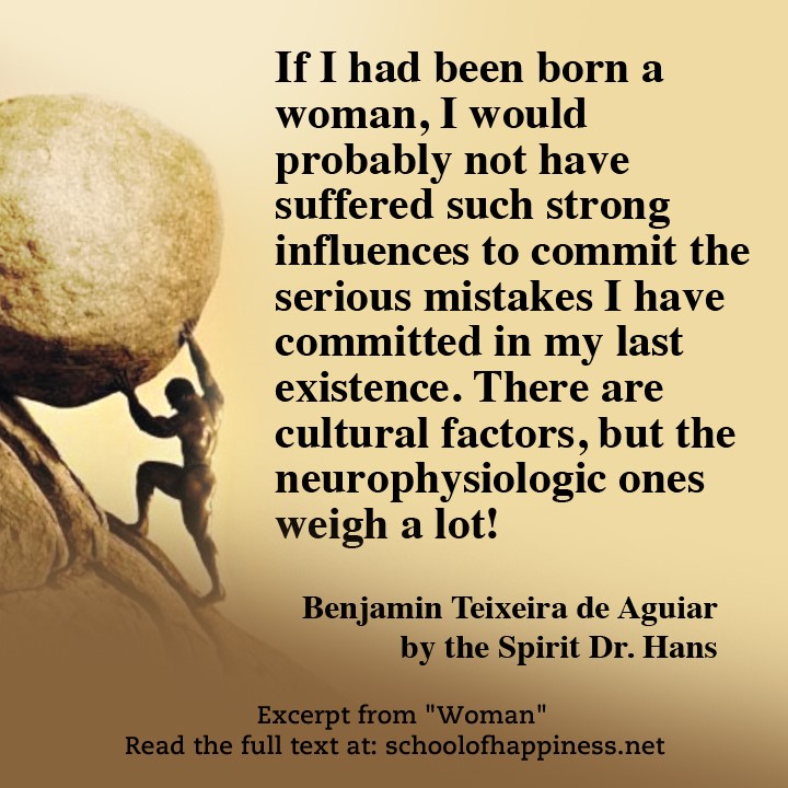 If I had been born a woman, I probably would not have suffered such strong influences to make the serious mistakes I have committed in my last existence. There are cultural factors, but the neurophysiological weigh a lot!